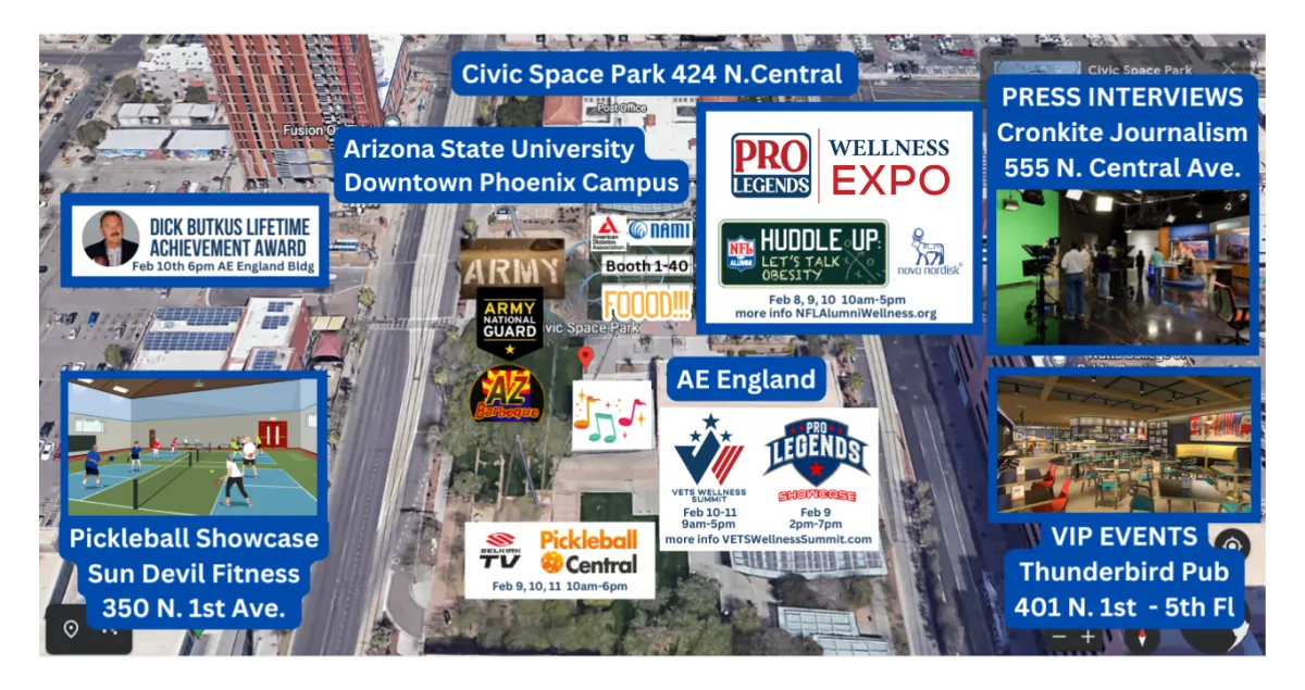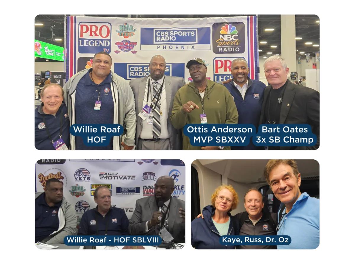 The VETS Wellness Village was launched at Super Bowl LVIII on media row where Dr. Harshfield and Russ Allen did interviews. Pictured is Willie Roaf, a Pine Bluff, Arkansas native and HOF NFL Great.